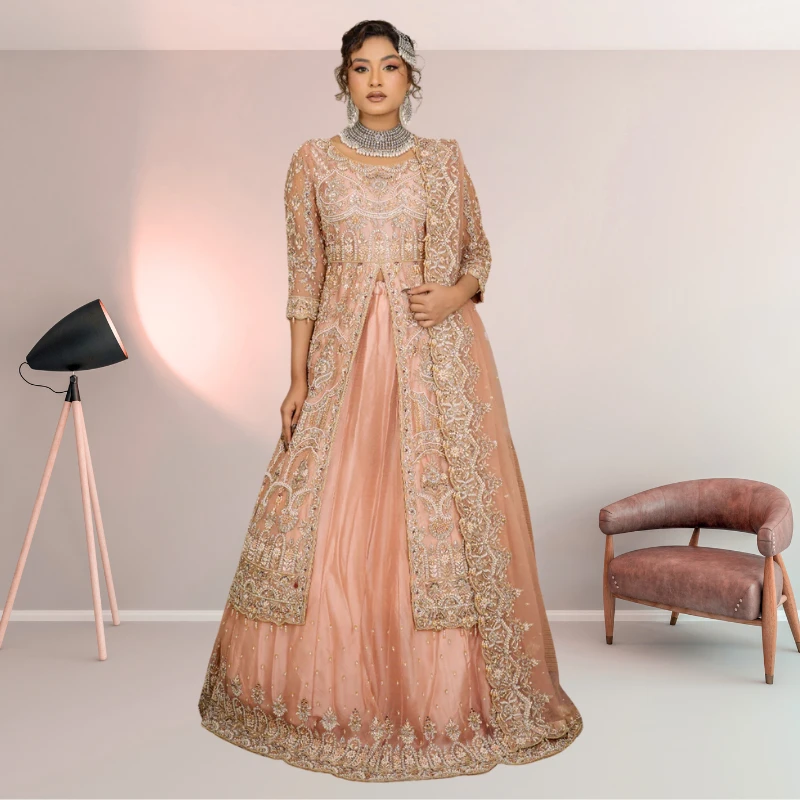 This customized bridal maxi features intricate patterns, showcasing traditional Eastern artistry with a modern twist. Whether you’re walking down the aisle or dancing the night away, this dress ensures you radiate beauty, sophistication, and grace in every moment.